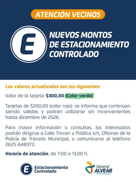 A partir de la fecha, entrarán en vigencia los nuevos montos correspondientes al servicio de Estacionamiento Controlado, conforme a la normativa municipal vigente.