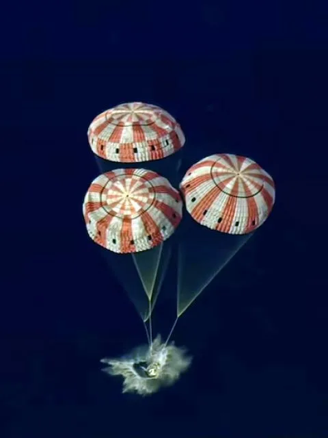 A 8.077 metros sobre el océano, la cápsula redujo su velocidad a 523 km/h gracias al frenado atmosférico. En ese punto, se activaron los sistemas pirotécnicos para el despliegue secuencial de los paracaídas. Primero, tres paracaídas de la cubierta de la bahía delantera de 2,1 metros de diámetro. Luego, dos paracaídas de frenado de 7 metros y, finalmente, a 2.896 metros, los tres paracaídas principales de 35,3 metros de diámetro y 140 kilogramos de peso cada uno. Este sistema desacelera la cápsula a menos de 32 km/h, la velocidad óptima para un amerizaje controlado.
