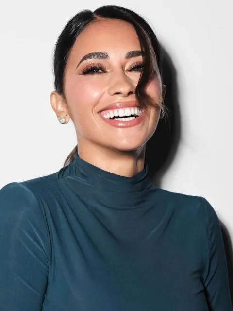 La sesión de fotos, desarrollada sobre fondo blanco y con luz suave, buscó destacar la naturalidad de la empresaria. La amplia sonrisa, junto a una expresión relajada, concentró la atención en su imagen y en los detalles del estilismo y el maquillaje.