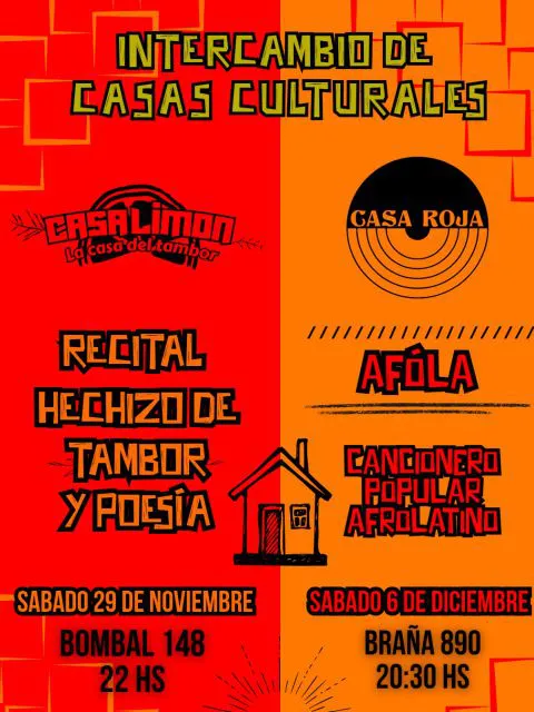Este sábado 29 a las 22:00, la Casa del Tambor -Bombal 148- recibe a las integrantes de Casa Roja con un recital denominado "Hechizo de tambor y poesía" donde actuarán Mónica Montenegro poniendo la voz a los poemas y la compañía musical de Mariana Segura en voz y percusión y Yasmín Rada en voz ritual. Para este encuentro ha sido invitada la poeta Mai Fornes.