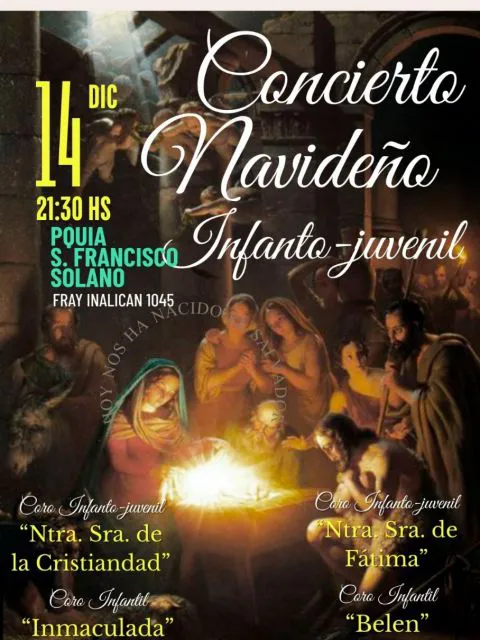 Este domingo 14 de diciembre, desde las 21:30 en las instalaciones de la parroquia San Francisco Solano, ubicada en Fray Inalicán 1045, se realizará un gran Concierto Navideño a cargo de cuatro coros infantojuveniles de San Rafael con entrada libre y gratuita.