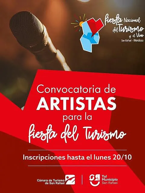 La Cámara de Turismo de San Rafael y el Municipio convoca a músicos solistas o bandas a participar de la convocatoria para ser parte de la Fiesta Nacional del Turismo y el Vino que se realizará en nuestra ciudad el 22 y 23 de noviembre próximos en el Parque de Los Jóvenes y en el Teatro Griego Chacho Santa Cruz.