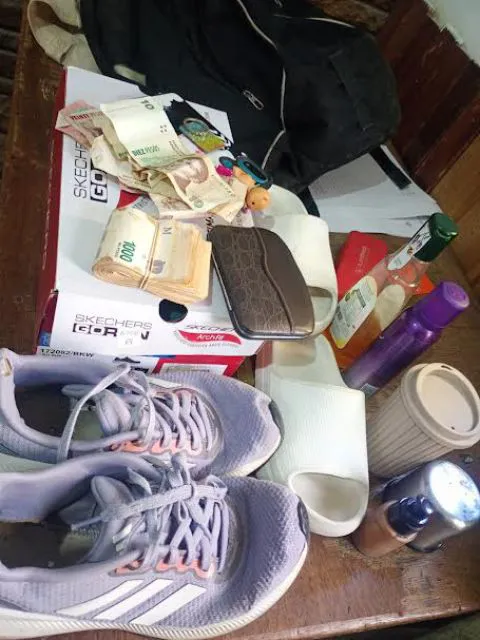 En el interior había un par de gomones color blanco, un teléfono celular Motorola con funda, un par de zapatillas en caja marca Skechers, dinero en efectivo, un par de zapatillas Adidas, un par de lentes recetados en caja y elementos de higiene personal.