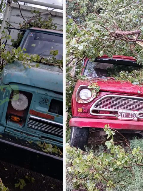 La fuerte tormenta del lunes por la tarde sigue mostrando su impacto. Un árbol de gran tamaño cayó sobre un Rastrojero y un camión Chevrolet C-60 en la calle Tulio Angrimán.