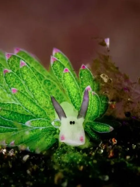 Esta pequeña babosa marina que recuerda a un animal de dibujos animados, crece hasta una longitud máxima de sólo 5 milímetros, enfatizando el dicho de que las cosas buenas vienen en frascos pequeños. Es una criatura fascinante. Su cuerpo es de un color verde vibrante debido a la presencia de cloroplastos que retiene de las algas de las que se alimenta. Su cabeza no es menos llamativa (puede que hasta un poco surrealista), tiene dos estructuras en forma de tentáculos conocidas como rinóforos, y su espalda está adornada con cerata, que se asemeja a la lana esponjosa de una oveja.