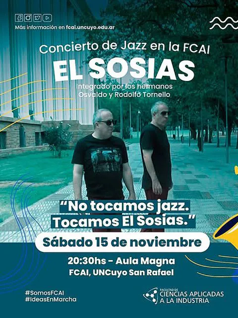 Este sábado 15 de noviembre a partir de las 20:30 se presentará en el Aula Magna de la Facultad de Ciencias Aplicadas a la Industria el dúo mendocino El Sosias, integrado por los hermanos Osvaldo y Rodolfo Tornello, referentes del jazz de cámara contemporáneo.