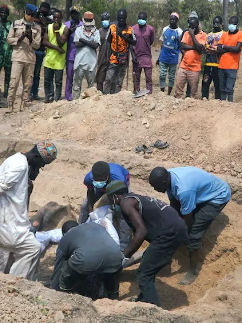 Los hombres envolvieron los cuerpos en telas blancas y los cargaron en camiones para enterrarlos. Aún salía humo del edificio incendiado. La oficina local del Cuerpo de Seguridad y Defensa Civil de Nigeria permaneció cerrada.