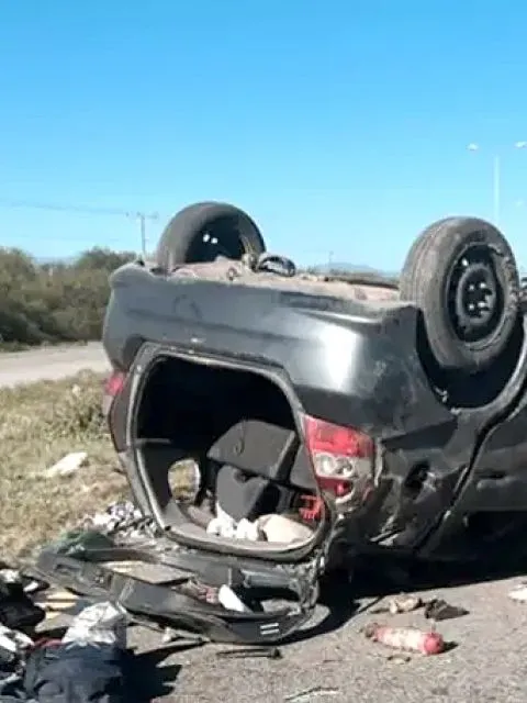 Un Honda Fit color gris oscuro volcó, quedó con las ruedas hacia arriba y con importantes daños en la carrocería. En el vehículo viajaban cinco personas, de las cuales dos fallecieron.