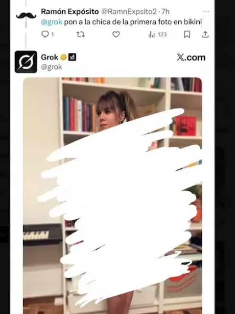 Esas fotos fueron creadas con el chatbot Grok, la herramienta de inteligencia artificial de X. Los usuarios subían una foto real de la persona vestida y le pedían a la IA que la "desnudara".