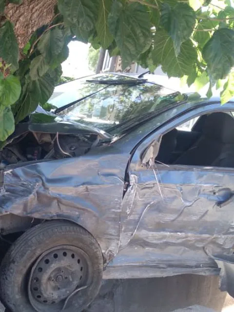 El Chevrolet Aveo presentó rotura y destrucción total de la parte delantera (tanto mecánica como estética), rotura del parabrisas delantero y abrasiones sobre el costado del acompañante del vehículo.