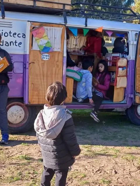 La docente Laura Visciglio, oriunda de La Matanza, en su visita San Rafael con "Doña Galinda", con su Kombi violeta convertida en una biblioteca rodante tuvo un desperfecto mecánico que ha detenido su estancia en nuestro departamento.