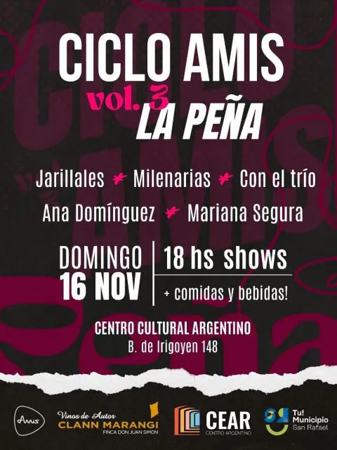 Juan Castro presidente de AMIS -Asociación de Músicos Independientes San Rafael- invitó a los amantes del folclore a la 3° edición del Ciclo AMIS, que se realizará este domingo 16 en el Centro Cultural Argentino a partir de las 18:00 donde actuarán Jarillares, Milenarias: Dúo Arias- Milanesi, Con el Trío, Ana Domínguez y Mariana Segura.
