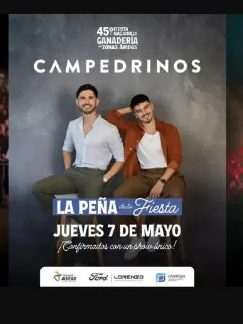 Además, el jueves 8 estará presente Campedrinos, el dúo que viene de brillar en Cosquín y la Fiesta Nacional de la Vendimia y que ha logrado captar la atención de jóvenes y millennials gracias a su folclore moderno y colaboraciones con artistas de diferentes géneros. A eso se le suma la presencia del popular DJ Pipo, famoso entre otras presentaciones por el strem "Un poco de ruido" y su denominación por parte de los fanáticos como el "Bizarrap de la cumbia".