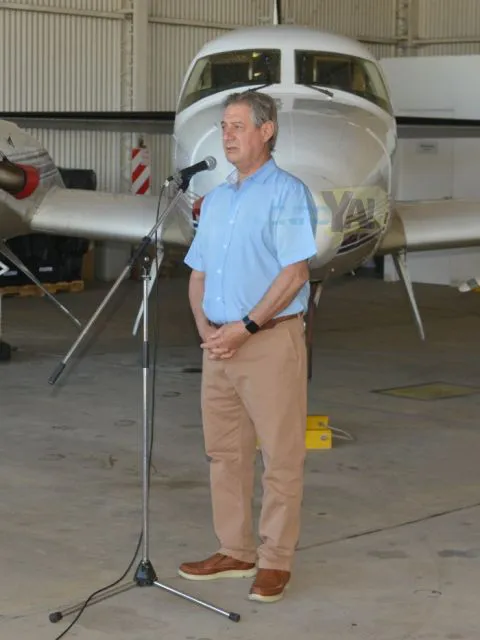 En uno de los hangares del Aero Club, Félix habló con la prensa luego de dar su discurso de apertura al que también asistió el secretario de Desarrollo del Municipio de General Alvear, Hugo Molina que representó al intendente Alejandro Molero.