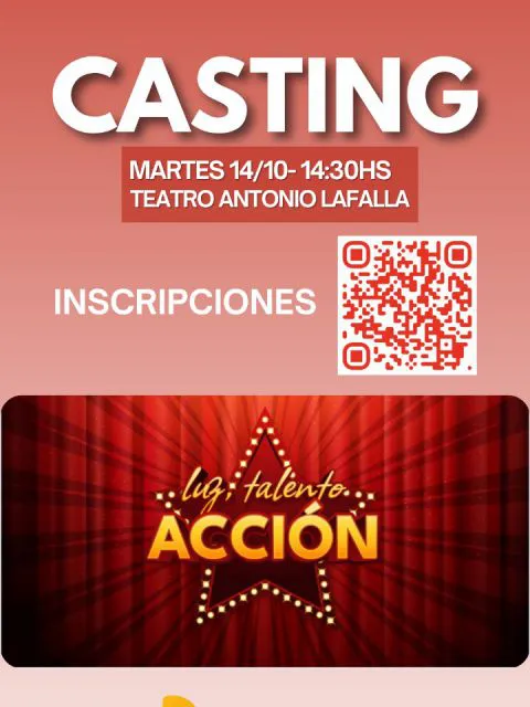 El próximo martes 14 de octubre, a las 14:30 horas, en el Teatro Antonio Lafalla, se llevará a cabo el casting: "Luz, Talento y Acción", destinado a artistas de General Alvear y del Sur Mendocino, incluyendo participantes de San Rafael y Malargüe.
