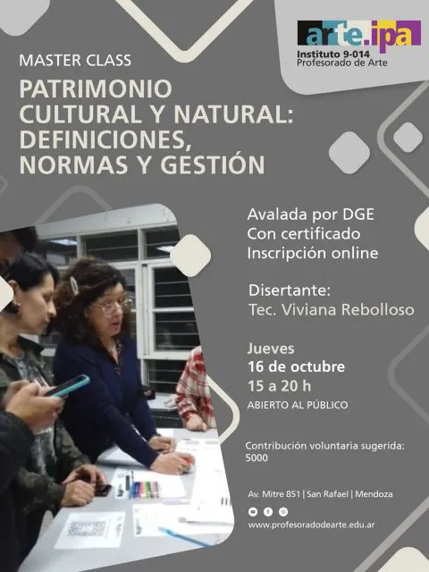 El próximo jueves 16 de octubre a partir de las 15:00 se dictará en el Profesorado de Arte -Av. Mitre 850- una master class sobre Patrimonio Cultural y Natural, definiciones, normas y gestión.