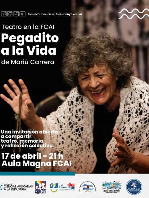 Esta noche a partir de las 21:00 se presentará en el Aula Magna de la Facultad de Ciencias Aplicadas a la Industria la obra "Pegadito a la Vida" el unipersonal de la actriz mendocina Mariú Carreras.