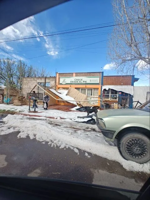 Hubo derrumbe de techos en dos domicilios, en uno de ellos funcionaría un taller mecánico que cedió por el peso del granizo cayendo sobre dos vehículos. El otro techo afectado, sería de una zapatería.