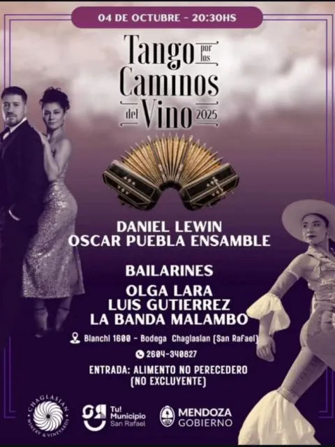 Este sábado a las 20:30 se desarrollará la edición local del festival provincial Tango por los Caminos del Vino en la bodega Chaglasian con la actuación de Daniel Lewin y Oscar Puebla y la danza de Olga Lara y Luis Gutiérrez, con entrada de un alimento no perecedero.