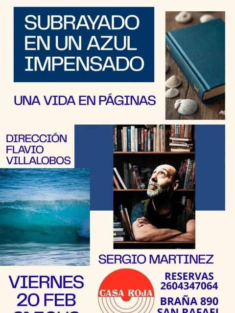 El próximo viernes 20 de febrero, a las 21:30 en Casa Roja -Braña 890- se presentará el actor mendocino Sergio Martínez con una comedia dramática titulada "Subrayado en un azul impensado- Una vida en páginas".
