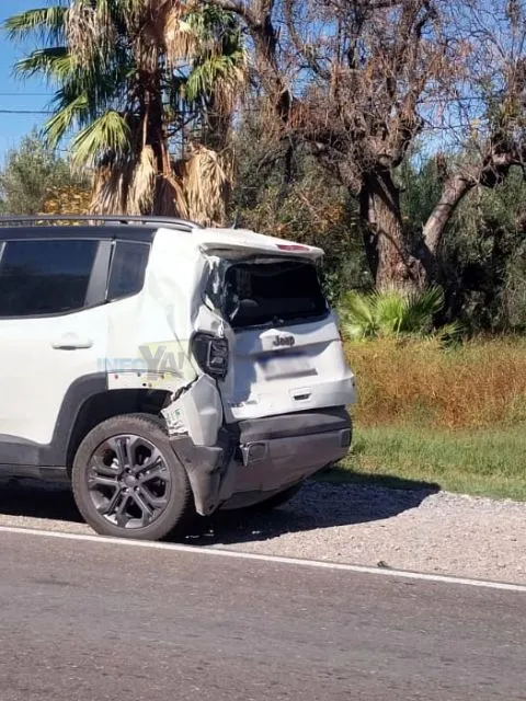 Como consecuencia del choque, el Jeep terminó con un hundimiento en la zona del portón trasero y el camión con daños en su frente.