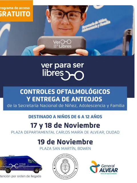 El programa nacional "Ver para ser Libres" llegará a General Alvear los días lunes 17, martes 18 y miércoles 19 de noviembre, ofreciendo controles de agudeza visual gratuitos y la entrega sin costo de anteojos a niños y niñas de entre 6 y 12 años.