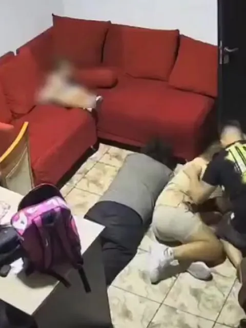 Una cámara de seguridad registró el ingreso de los agresores, que entraron a la oficina y apuntaron a una mujer y su esposo frente a su hija menor. En las imágenes se puede observar cómo uno de los asaltantes ordenó a la madre que se arrojara al suelo, mientras el padre ya se encontraba reducido y boca abajo. Luego, pese a que la mujer no le opuso resistencia, comenzó a golpearla.