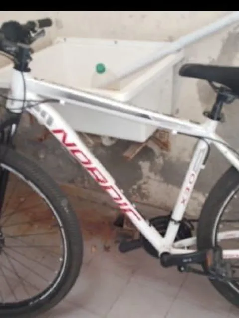 Es una bicicleta de color blanca, Marca: Nordic (letras rojas), tiene un sticker de Lilo y Stitch, también una cinta roja en los cables de los frenos. La rueda de adelante esta descentrada.