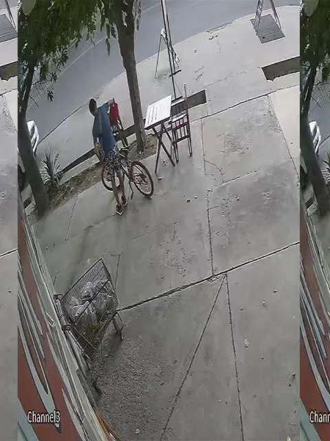 Video: Robó una silla de un minimercado y se la llevó en bicicleta