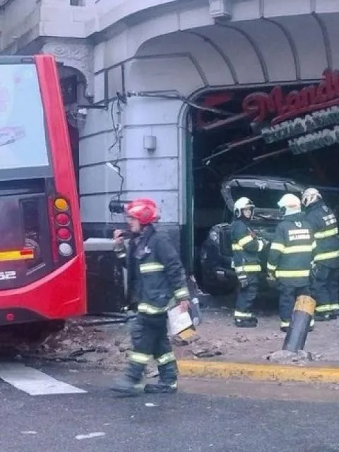 Video: un patrullero y un micro se incrustaron en una pizzería en Buenos Aires