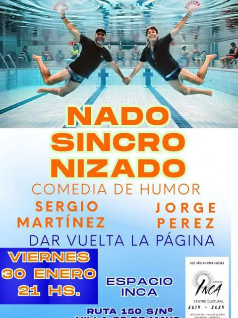 "Nado Sincronizado" se llama la comedia de humor que presentarán en el Centro Cultural Espacio Inca de la Villa 25 de Mayo, los actores mendocinos Jorge Pérez y Sergio Martínez, este viernes 30 desde las 21:00.