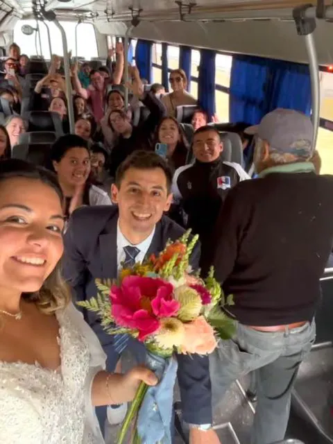 "Nos dijo que a todo el grupo no lo podía llevar, pero que a nosotros dos sí", recordaron entre carcajadas. Ese fue el límite amable que convirtió la improvisación en una escena perfecta: los recién casados subiendo al colectivo mientras el resto del grupo se quedaba saludando desde afuera y los pasajeros se asombraban.