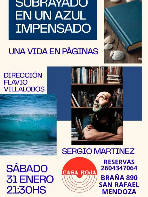 El próximo sábado 31 de enero, a las 21:30 en Casa Roja -Braña 890- se presentará el actor mendocino Sergio Martínez con una comedia dramática titulada "Subrayado en un azul impensado- Una vida en páginas".